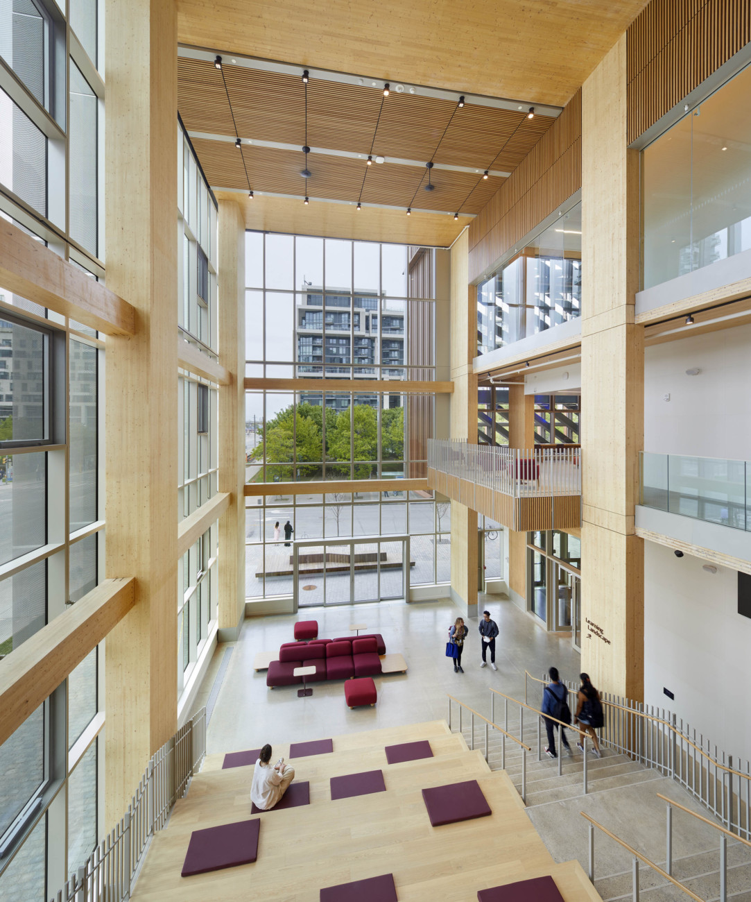 Designed by Moriyama Teshima Architects in joint venture with Acton Ostry Architects, the ten-storey structure brings together the college’s School of Architectural Studies, the Tall Wood Research and Innovation Institute, and a mix of classrooms, wellness spaces, childcare, and event facilities. The result is a vibrant, student-centred environment that fosters creativity, collaboration, and connection.