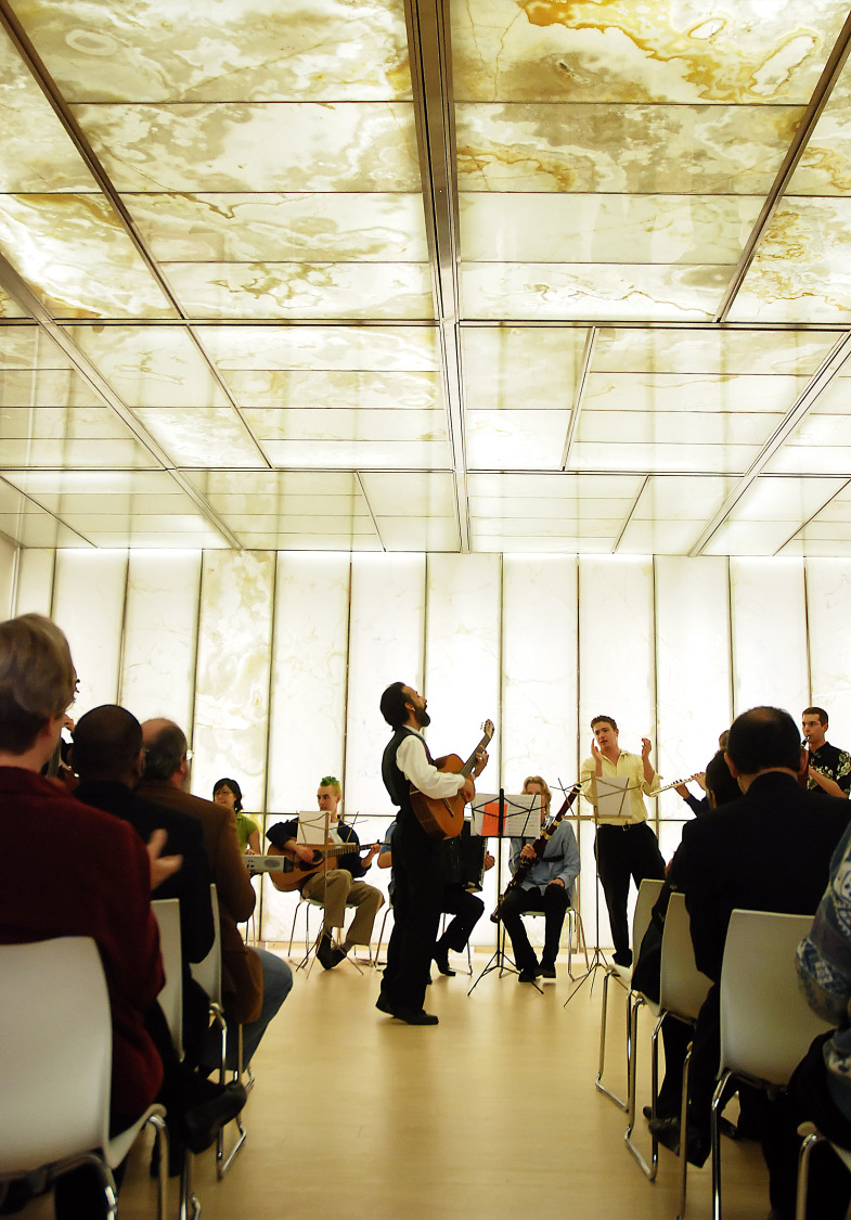 Light, both in the spiritual and metaphysical sense, emerged as a theme during the iterative design process and became the central feature of the main facility hall. A dramatic ceiling and front wall of backlit translucent white onxy illuminate the space, creating a mosaic that subtly references the religious structure of all faiths.