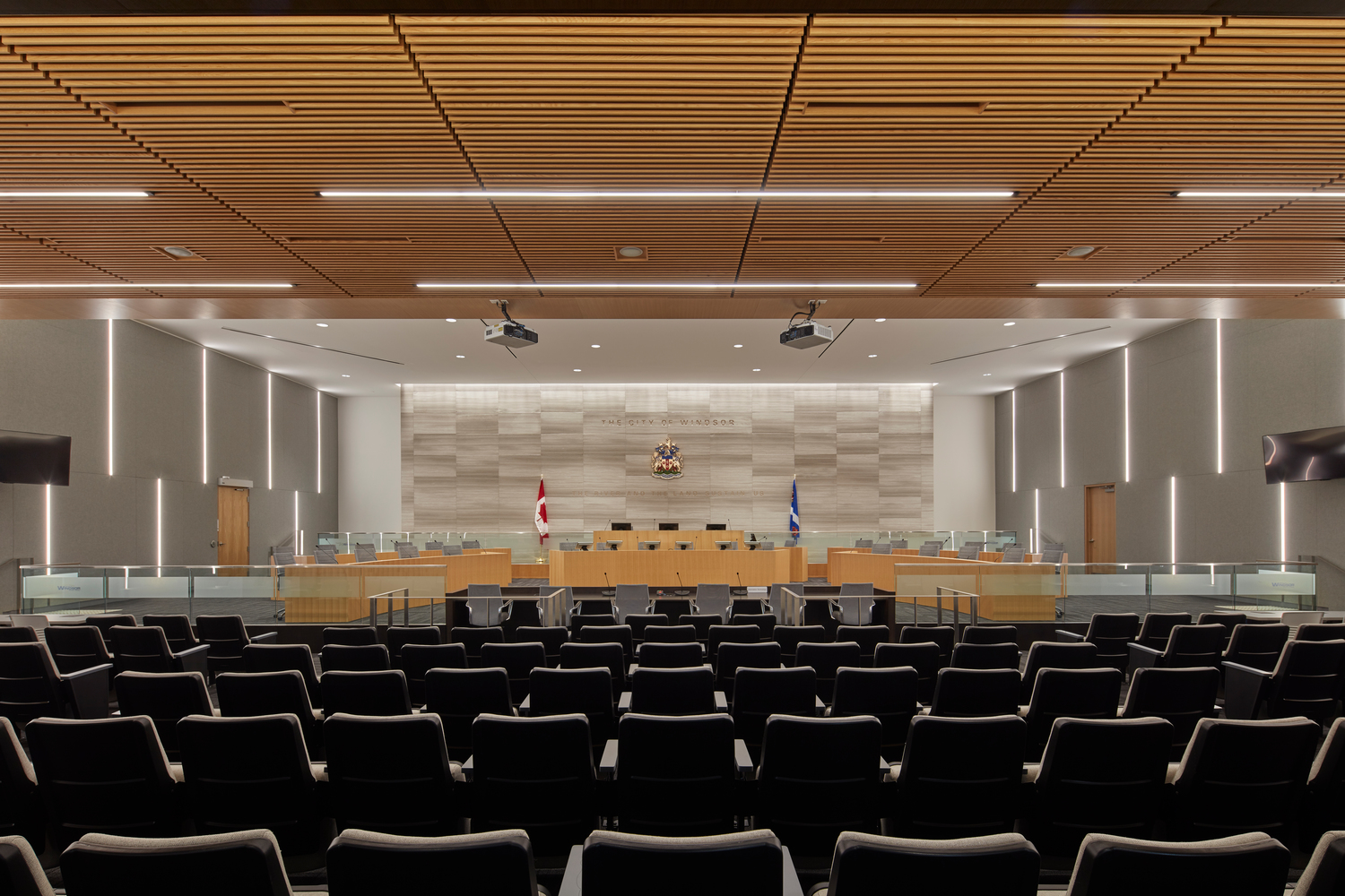 Features of the facility also include short-stay counters, a feature stair leading to public meeting rooms, a long-stay counter on the second floor, and a council chamber with an operable glass partition that can be opened to accommodate special events.